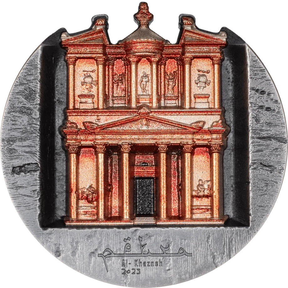 Rewers ukazuje monumentalną fasadę Al-Khazneh odwzorowaną w ultrawysokim reliefie, z realistycznym zróżnicowaniem struktury skały i bogatym kolorowaniem.