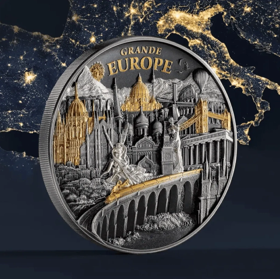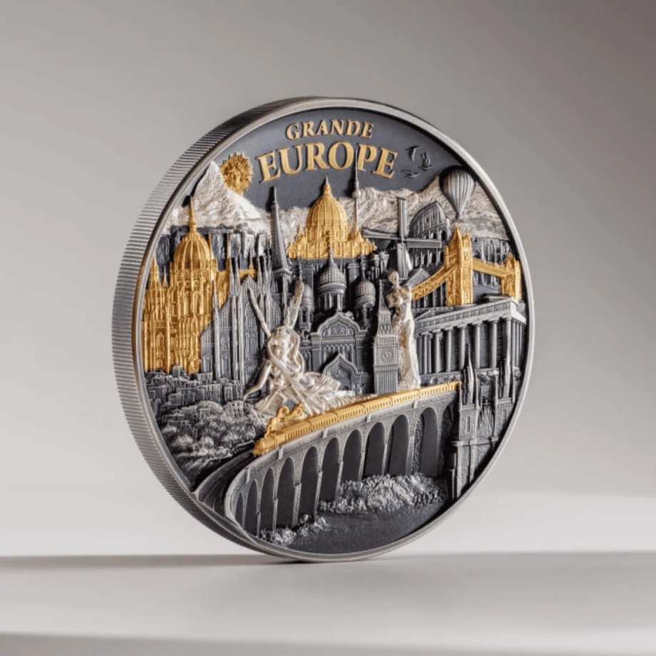 Cook Islands: Hidden Treasure – Grande Europe pozłacany 3 uncje Srebra 2025 Antiqued High Relief zabiera kolekcjonerów w podróż po Europie. Wchodząc w skład serii Hidden Treasure, emisja ta łączy dzieje kontynentu, dopracowaną warstwę artystyczną oraz subtelną zabawę — idealną dla osób ceniących opowieści wyrażone w srebrze.