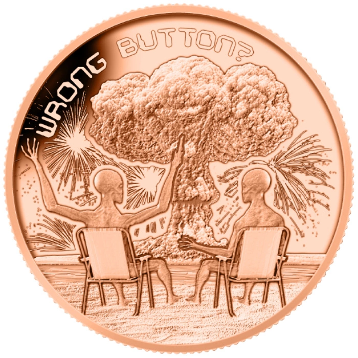 Awers: Ukazuje parę kosmitów siedzących na krzesłach i spoglądających w dal na potężny grzyb atomowy. Nad sceną umieszczono wymowną inskrypcję „WRONG BUTTON”, która w żartobliwy sposób komentuje katastrofalny finał ich eksperymentu.