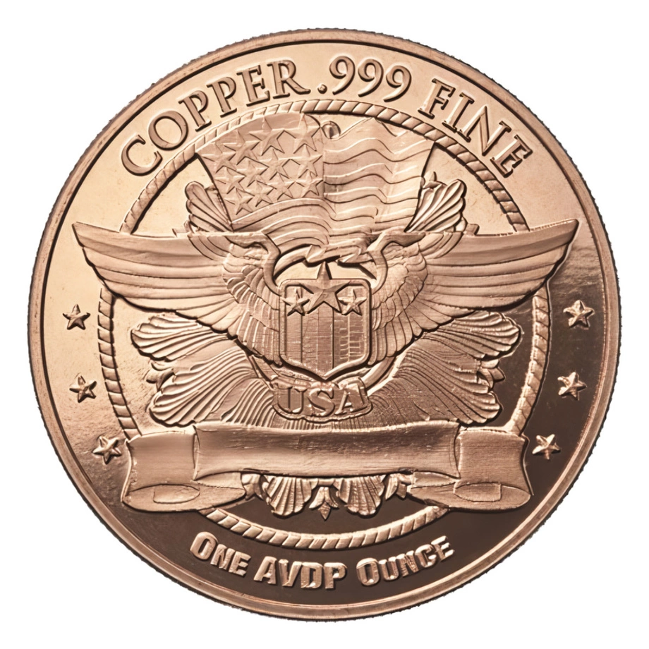 Rewers prezentuje artystyczną kompozycję motywów patriotycznych, w szczególności charakterystycznych skrzydeł oraz flagi Stanów Zjednoczonych. Wzdłuż otoku widnieją inskrypcje z parametrami technicznymi emisji: nominalną wagą „ONE A.V.D.P. OUNCE” oraz czystością kruszcu „COPPER .999 FINE”, pełniącymi potwierdzenie autentyczności i wartości materiałowej. Całość dopełniają symboliczne gwiazdy patriotyczne.