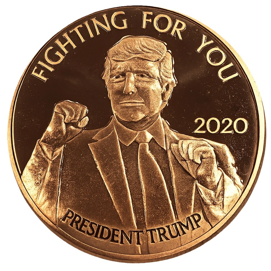 Awers przedstawia Donalda Trumpa w dynamicznej pozie – z uniesionymi rękami ułożonymi jak w walce bokserskiej. Powyżej umieszczono napis FIGHTING FOR YOU, a poniżej PRESIDENT TRUMP. Rok 2020 widnieje po prawej stronie. Całość wykonana została w szczegółowym reliefie, podkreślającym wyrazistość projektu.