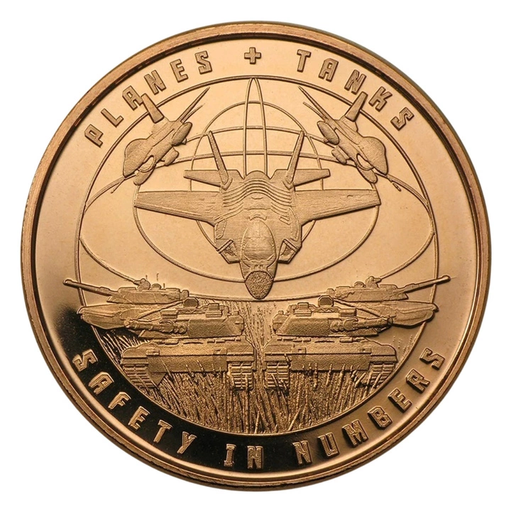 Planes and Tanks 1 uncja Miedzi to jednouncjowy medal z serii Safety in Numbers, wybity z miedzi o wysokiej próbie. Łączy militarną symbolikę lotnictwa i broni pancernej z ideą ochrony wartości materialnych oraz bezpieczeństwa bliskich. Projekt stanowi mocny komentarz do roli współczesnych sił zbrojnych jako gwaranta stabilności, a zarazem akcentuje znaczenie „realnych” aktywów w czasach niepewności. Dopracowany relief i wyraziste inskrypcje nadają walorowi profesjonalny, katalogowy charakter, szczególnie ceniony przez kolekcjonerów tematyki militarnej.