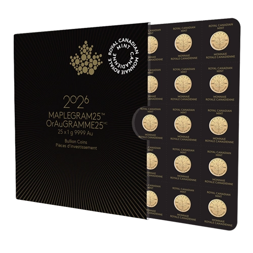 Ugruntowana stabilność, światowa rozpoznawalność i klasyczne wzornictwo stworzone przez Waltera Otto sprawiają, że złote monety Maple Leaf od ponad czterdziestu lat pozostają jednym z najbardziej zaufanych wyborów inwestycyjnych. Wersja Maplegram 25™ z rocznika 2026 zapewnia dodatkową wygodę przechowywania i późniejszej odsprzedaży — każdy gramowy walor umieszczony jest w osobnej kapsule, stanowiącej element większej, precyzyjnie zaprojektowanej matrycy. Dzięki temu inwestor może bez trudu wydzielać pojedyncze monety lub pozostawić cały zestaw w oryginalnej, nienaruszonej formie.
