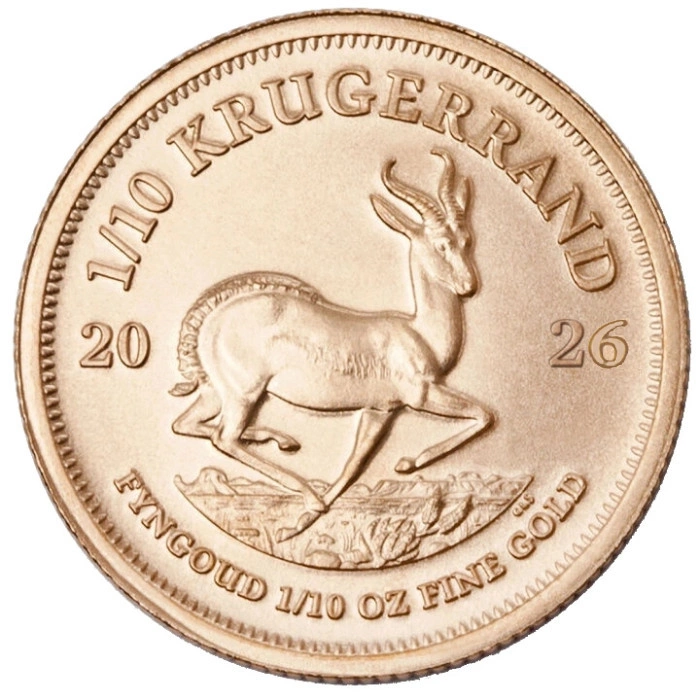 Rewers: przedstawia antylopę springbok – narodowy symbol RPA. Po obu stronach widnieją cyfry roku emisji 2026, a pod wizerunkiem zwierzęcia umieszczono napis „FYNGOUD 1/10 OZ FINE GOLD”, informujący o ilości czystego złota w monecie. Klasyczna kompozycja pozostaje wierna charakterowi serii, podkreślając jej prestiż i wiarygodność inwestycyjną.