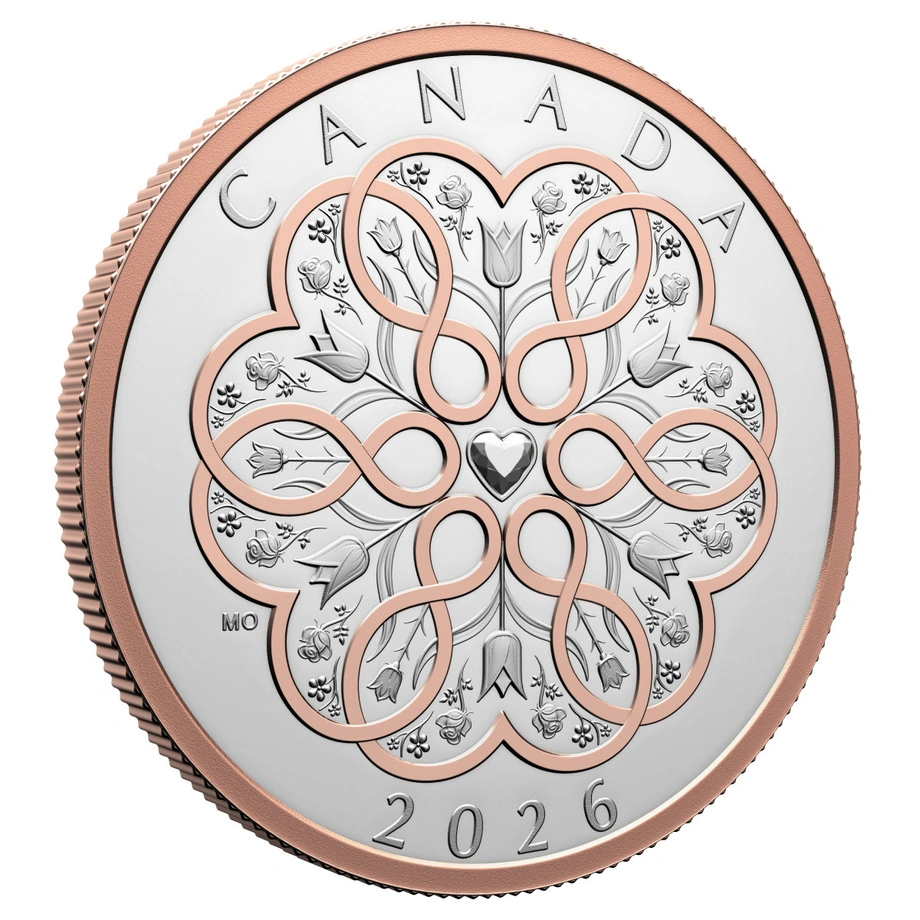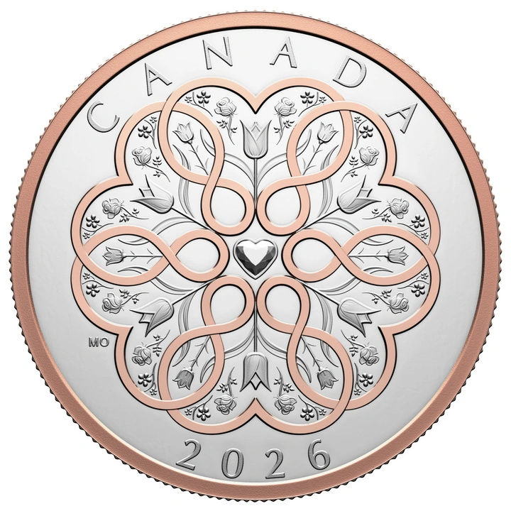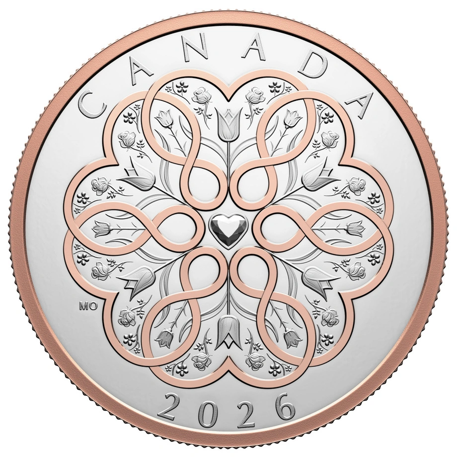 Canada: Celebrate Love $20 pozłacany Srebro 2026 Proof to wyrafinowana moneta kolekcjonerska z czystego srebra próby 99,99% o nominale 20 dolarów, zdobiona selektywnym różowozłotym pozłoceniem. Emisja na rok 2026 oddaje hołd miłości w każdej odsłonie – romantycznej, rodzinnej i przyjacielskiej, a także tej skierowanej ku samemu sobie. Projekt ukazuje ponadczasowy bukiet: tulipany jako symbol odnowy i czułości, róże oznaczające piękno i oddanie oraz fairy thimble, przywodzący na myśl drobne, magiczne chwile codzienności. Całość spaja różowozłota wstęga układająca się w kształty serc oraz znak nieskończoności.