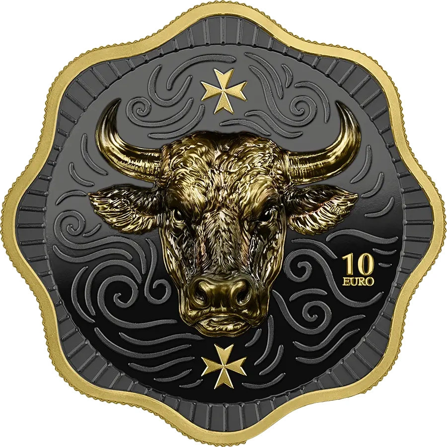 Moneta 2024 Malta Maltese Ox 10 Euro 2 oz Silver BU High Relief została wybita z dwóch uncji srebra próby .9999 i wzbogacona starannym pozłacaniem. Limitowana do 500 sztuk, stanowi wartościowy i wyróżniający się element każdej kolekcji.