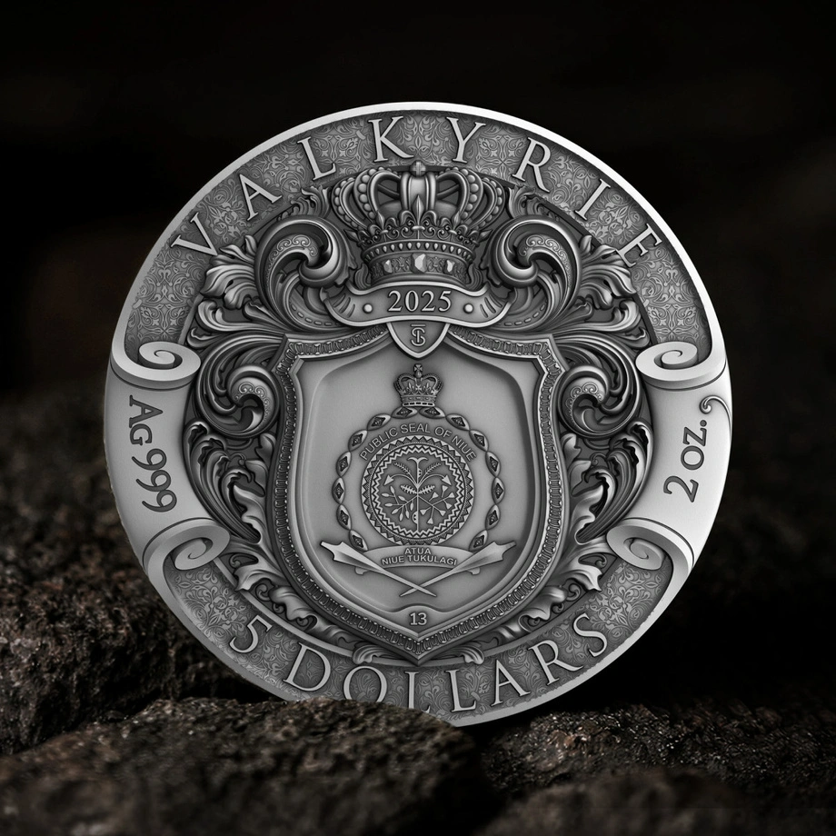 Niue: Valkyrie pozłacany 2 uncje Srebra 2025 Antiqued Coin to okazała moneta kolekcjonerska czerpiąca z mitologii nordyckiej i jednej z jej najbardziej intrygujących postaci – Walkirii, boskiej posłanniczki Odyna, symbolizującej odwagę, mądrość oraz nieuchronność przeznaczenia.
