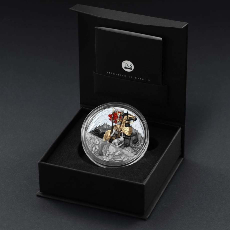 Ta moneta o masie 2 uncji, wybita ze srebra próby Ag 999, wykończona w technice antiqued i wzbogacona selektywnym pozłacaniem, oddaje surowy, epicki klimat nordyckich podań. Kontrast postarzanego tła z pozłacanymi akcentami wydobywa moc, majestat i nadnaturalną aurę Walkirii, tworząc wyrazisty przykład sztuki medalierskiej.