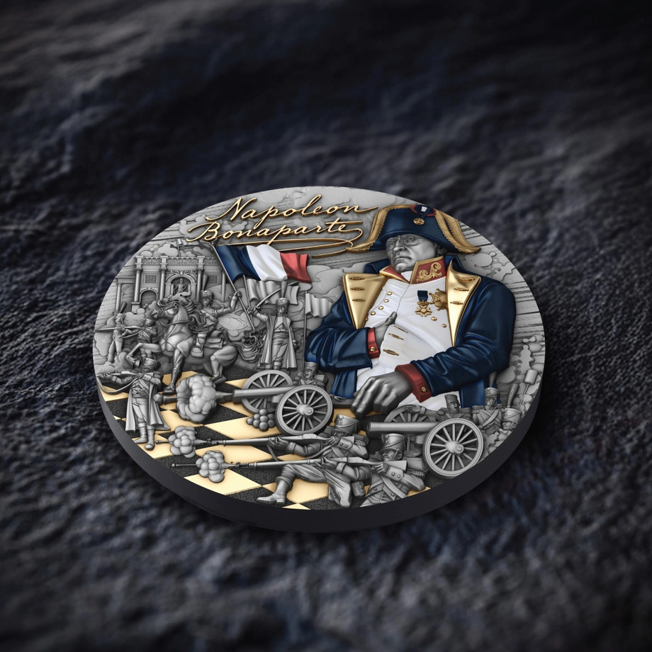 Niue: Visionaries in History – Napoleon Bonaparte pozłacany 2 uncje Srebra 2025 Antiqued Coin inauguruje serię Visionaries in History, poświęconą wybitnym jednostkom, które dzięki determinacji i wizjonerstwu wpływały na dzieje świata. Napoleon Bonaparte – jeden z najznamienitszych dowódców wojskowych – stał się symbolem ambicji, strategii i nieugiętej woli. Od generała po cesarza Francji zasłynął mistrzowską taktyką, nowatorskim podejściem do wojskowości oraz umiejętnością adaptacji do zmiennych realiów politycznych i militarnych.