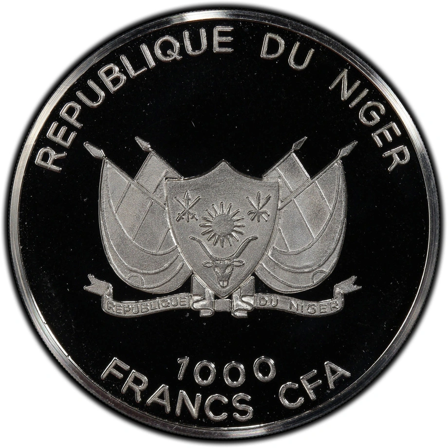 Awers ukazuje herb Republiki Nigru oraz inskrypcje „REPUBLIQUE DU NIGER” i „1000 FRANCS CFA”, potwierdzające kraj emitenta oraz wartość nominalną monety. Układ awersu zachowano w klasycznej orientacji monetarnej.