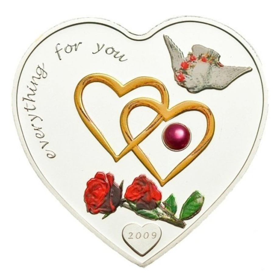 Palau: 5$ Everything for You 1 uncja Srebra 2009 Shaped Coin to kolekcjonerska moneta o kształcie serca, wybita dla Republiki Palau. Emisję wykonano ze srebra próby 999, o masie 25 g i nominale 5 dolarów. Projekt należy do nurtu monet okolicznościowych, w których forma staje się integralną częścią przekazu. Kompozycję uzupełnia kolorowany motyw oraz wstawka w postaci perły, nadająca całości charakter numizmatycznej biżuterii. Rocznik 2009 wskazano w projekcie jako element identyfikacyjny edycji.