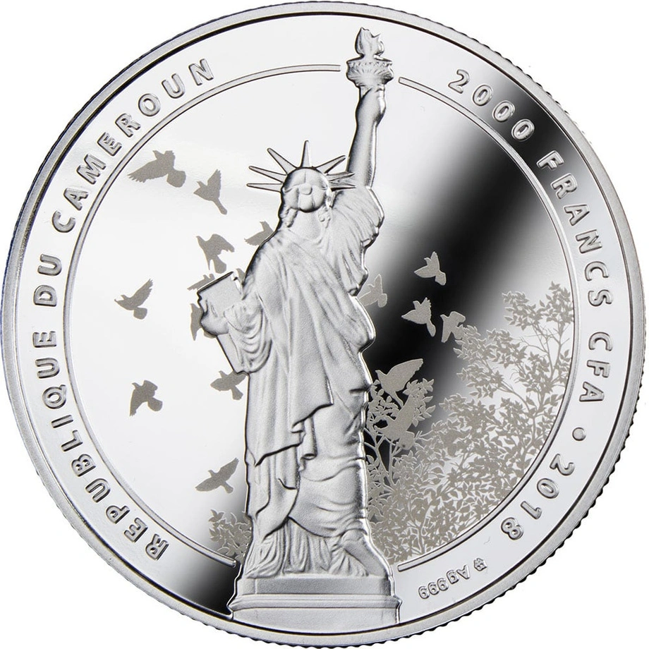 Awers: zawiera wizerunek Statuy Wolności ukazany z nietypowej perspektywy – od tyłu. Na awersie umieszczono także informacje o emitencie (Republika Kamerunu), nominale 2000 franków CFA, roku emisji 2018 oraz próbie kruszcu.
