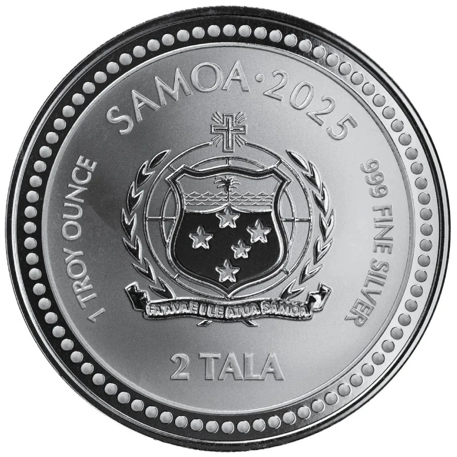 Awers zawiera herb Samoa, nominał 2 Tala, rok emisji 2025 oraz informacje o wadze i czystości srebra. Moneta posiada karbowany rant i jest legalnym środkiem płatniczym w kraju emitenta.