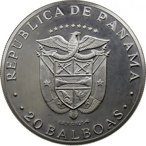 Awers: przedstawia herb Panamy wraz z napisem REPÚBLICA DE PANAMÁ oraz oznaczeniem wartości nominalnej 20 BALBOAS, potwierdzającym oficjalny charakter monety jako środka płatniczego.