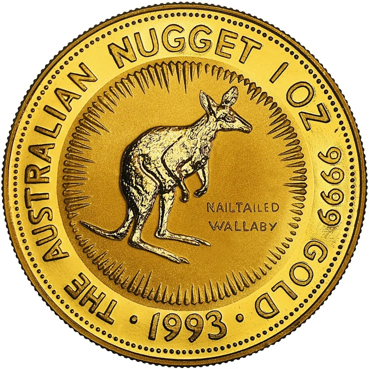 Rewers ukazuje sylwetkę kangura w naturalnym otoczeniu. W otoku znajdują się informacje o wadze, próbie złota oraz rocznik emisji 1993, a także napis AUSTRALIAN NUGGET, tworząc harmonijną kompozycję.