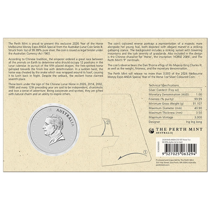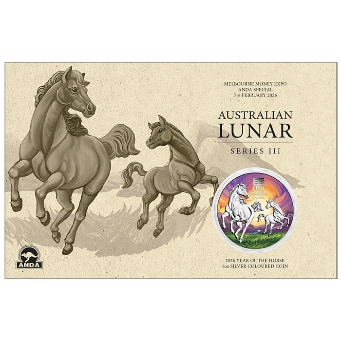 Moneta kolekcjonerska Perth Mint: Lunar III – Rok Konia została wybita w 2026 roku z 1 uncji srebra najwyższej próby 9999 przez mennicę The Perth Mint jako edycja Melbourne Money Expo ANDA Special. Wchodzi w skład prestiżowej serii Australian Lunar Coin Series III, celebrującej znaki zodiaku kalendarza chińskiego.