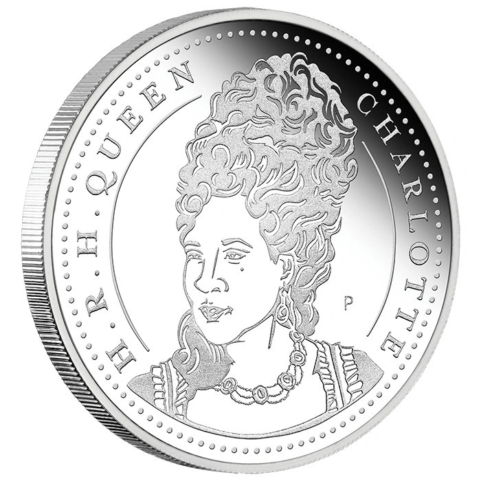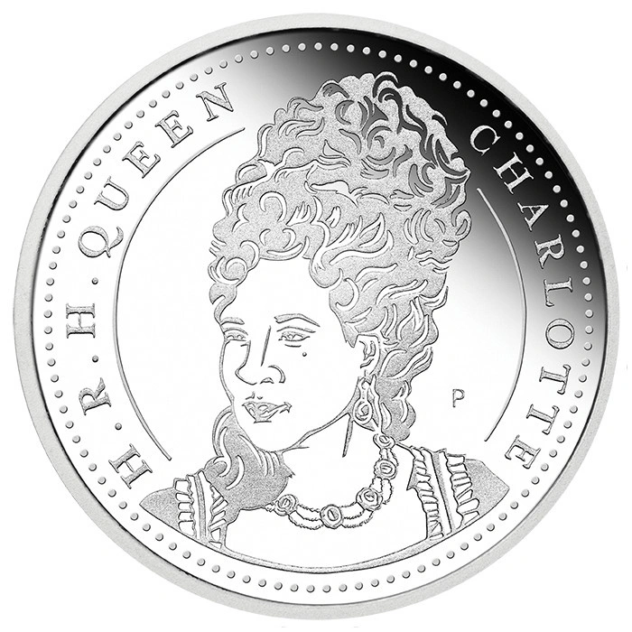 Rewers ukazuje szczegółowy portret królowej Charlotty, otoczony dekoracyjnym pierścieniem inspirowanym monetami regencji. Elementy graficzne uzupełniono napisem H.R.H QUEEN CHARLOTTE oraz menniczym oznaczeniem P, podkreślającym autentyczność i renomę pochodzenia.