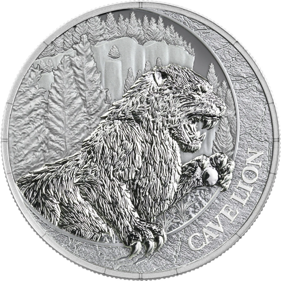 Awers przedstawia lwa jaskiniowego tuż przed skokiem – z napiętą muskulaturą i wyrazem instynktu, w tle znajdują się góry i pradawna roślinność, oddające klimat świata sprzed tysięcy lat.
