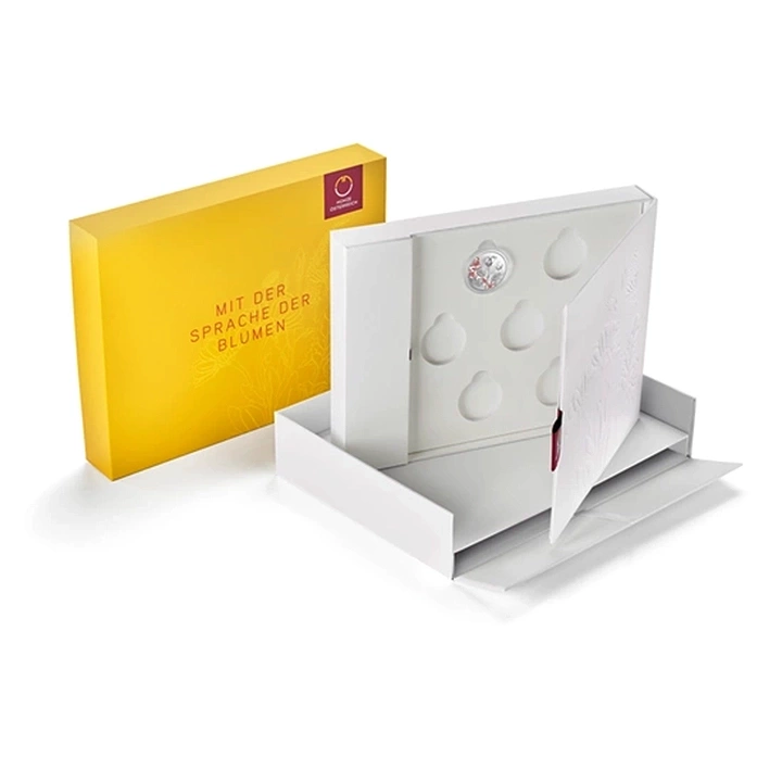 Kaseta z książką do monet to produkt, który pochodzi z serii The language of flowers. Kaseta posiada książkę oraz przeznaczone jest na 7 kolorowanych monet w standardzie proof, przedstawiających różę, mniszek lekarski, nagietek, niezapominajkę, rumianek, piwonię i fiołek, o nominale 10 Euro.