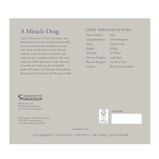 Moneta 100. Rocznica odkrycia insuliny 8 gramów Miedzioniklu 2021 to walor upamiętniający 100. rocznicę wyizolowania insuliny. Tego wielkiego odkrycia dokonał Sir Frederick Banting w 1921 roku. Dwa lata później został laureatem Nagrody Nobra, jako 32-letni mężczyzna.