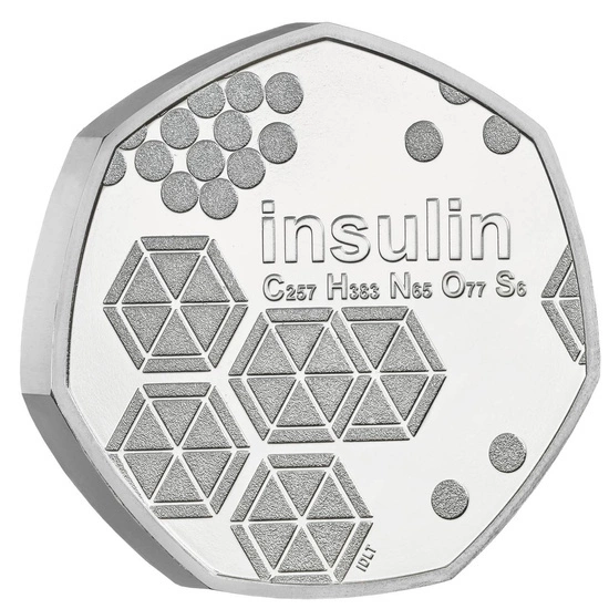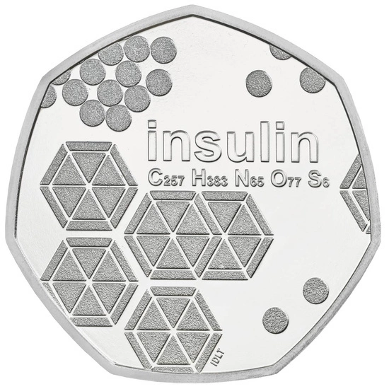 Rewers przedstawia napis "Insulin" oraz wzór sumaryczny. Projektantką rewersu była Iris De La Torre.