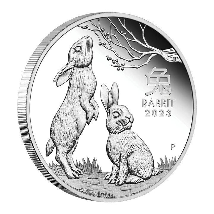 Rewers ukazuje dwa króliki, z czego jeden siedzi, a drugi stoi na tylnych łapkach. Na rewersie znajduje się również chiński znak „królik”, napis „RABBIT 2023” oraz literę "P" czyli znak mennicy The Perth Mint. Projektantem rewersu był Ing Ing Jong.