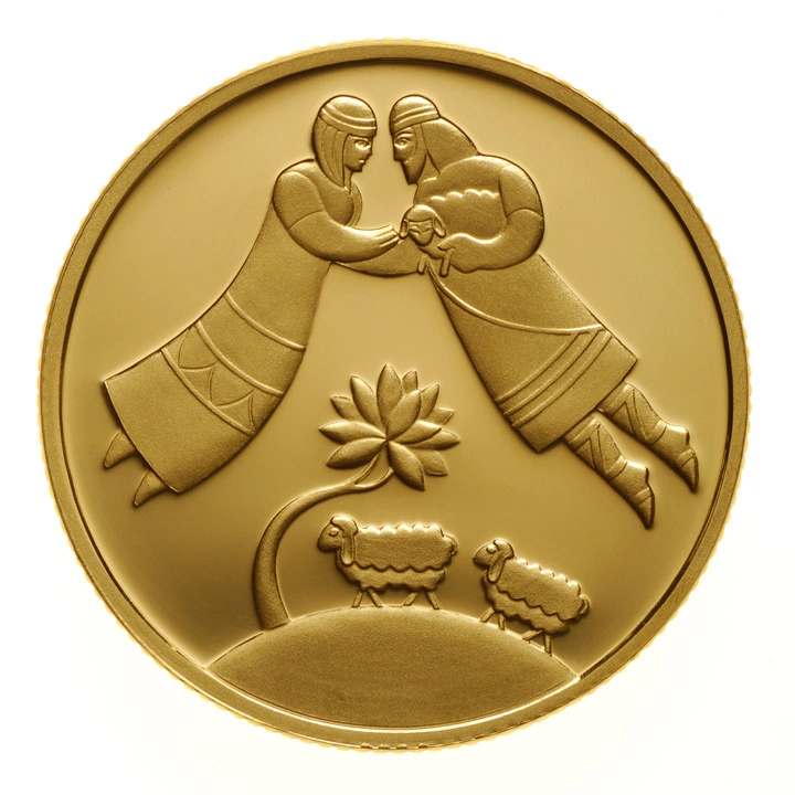 Jacob and Rachel 10 NIS Złoto 2003 Proof to 8 moneta z serii "Biblical Art". Egzemplarz nawiązuję do historii biblijnej Jakubie i Racheli.