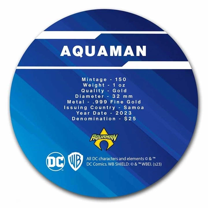 Na rewersie widnieje postać kultowego superbohatera - Aquaman'a. Dodatkowo, po stronie rewersu została zamieszczona informacja o wadze i czystości złota oraz napis "AQUAMAN".