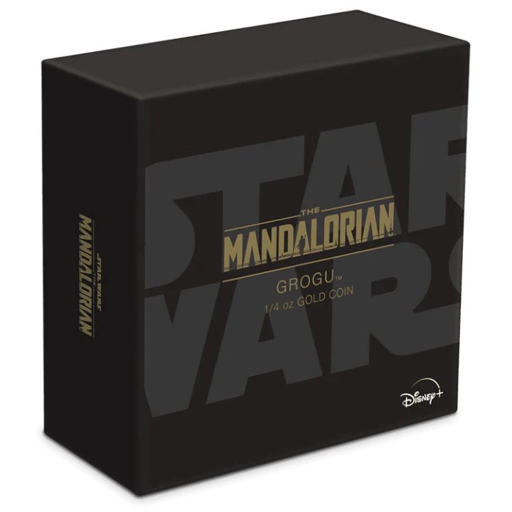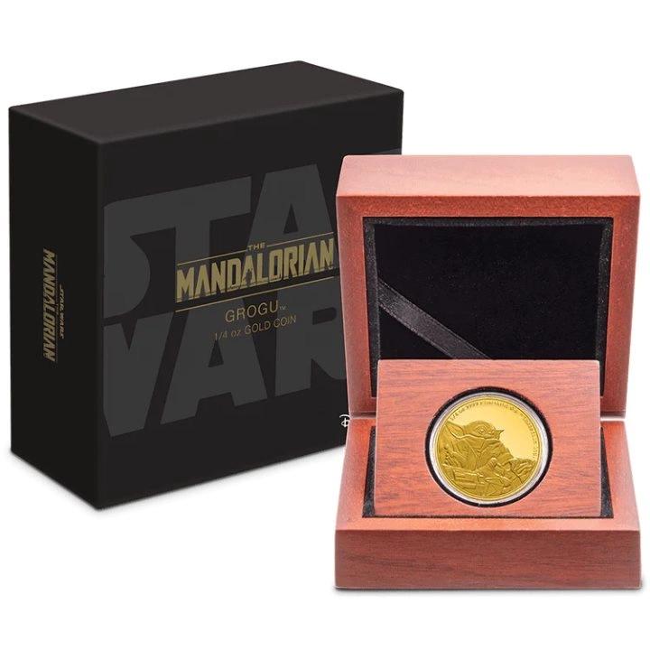 Niue: Star Wars The Mandalorian – Grogu 1/4 uncji Złota 2022 Proof to moneta z serii "The Mandalorian", która przedstawia Grogu - potocznie nazywany Baby Yodą. Bohater pojawia się w serialu "The Mandalorian" wyprodukowany przez Lucasfilm Ltd. Złota moneta Star Wars to prawdziwa gratka dla fanów kultowej serii filmów George'a Lucas'a, którzy szukają pewnej i sprawdzonej inwestycji.