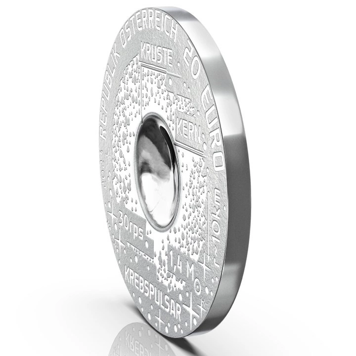 Awers przestawia gwiazdę neutronową, która powstała z supernowej w roku 1054. Na awersie, znajduje się także napisy: "KRUSTE", "KERN", "KREBSPULSAR" oraz rok bicia monety, nominał i "REPUBLIK ÖSTERREICH".