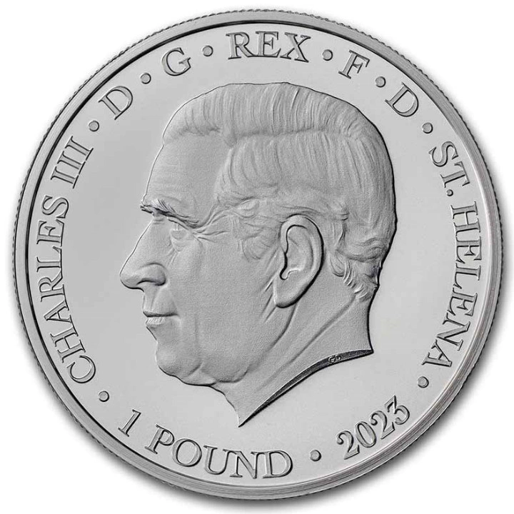 Awers srebrnej monety prezentuje Króla Wielkiej Brytanii Karola III, napis "CHARLES III∙D∙G∙REX∙F∙D" oraz "ST. HELENA" Na awersie znajduje się także informacja o roku i wartości nominalnej monety.