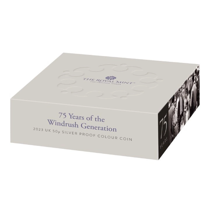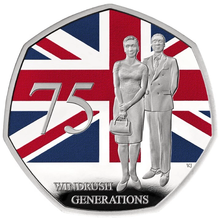75 Years of the Windrush Generation kolorowany 50p Srebro 2023 Proof to unikatowy walor upamiętniający 75 lat od przybycia wielu brytyjskich obywateli urodzonych poza granicami kraju, którzy przybyli do Wielkiej Brytanii w latach 1948-1973. Pokolenie pomogło odbudować powojenną Wielką Brytanię.