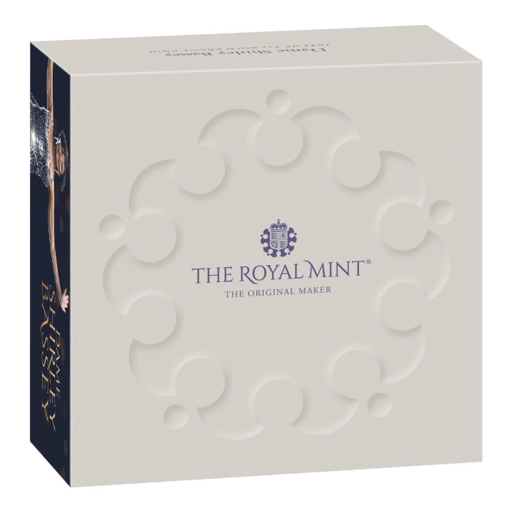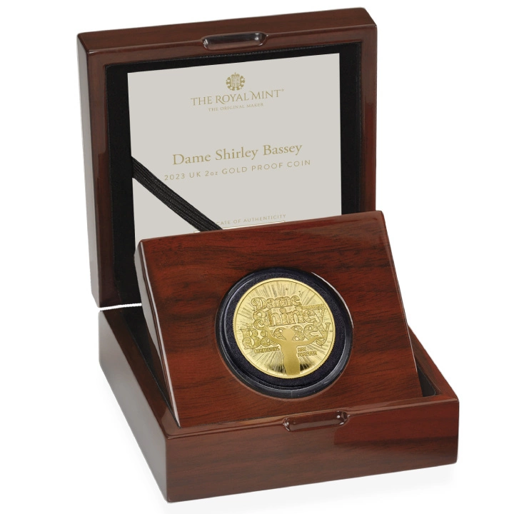 Dame Shirley Bassey 2 uncje Złota 2023 Proof prezentuje słynną, walijską piosenkarkę Dame Shirley Bassey, która jest znana głównie z wykonania piosenek tytułowych do filmów o Jamesie Bondzie.