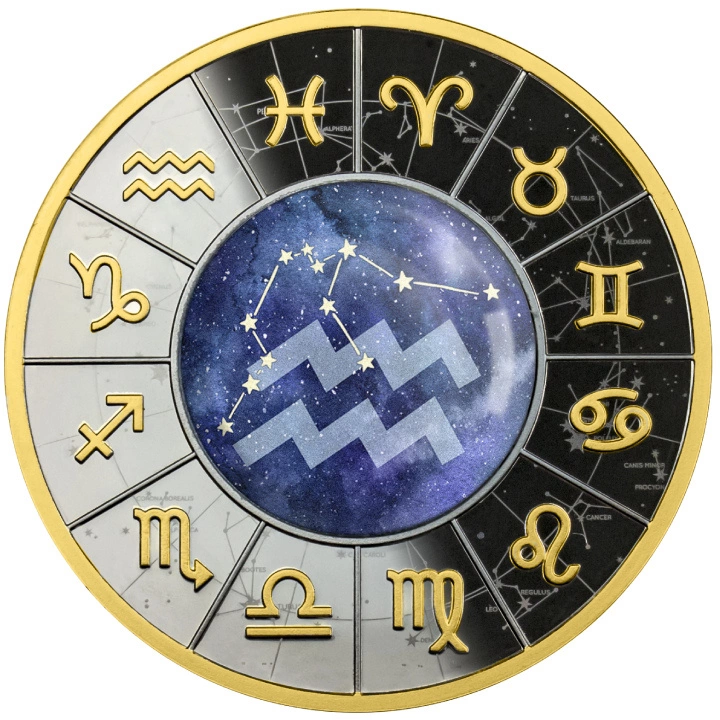 Cameroon: Znaki Zodiaku - Wodnik kolorowany, pozłacany Srebro 2023 Black Proof to srebrna, kolekcjonerska moneta serii "Znaki Zodiaku".
