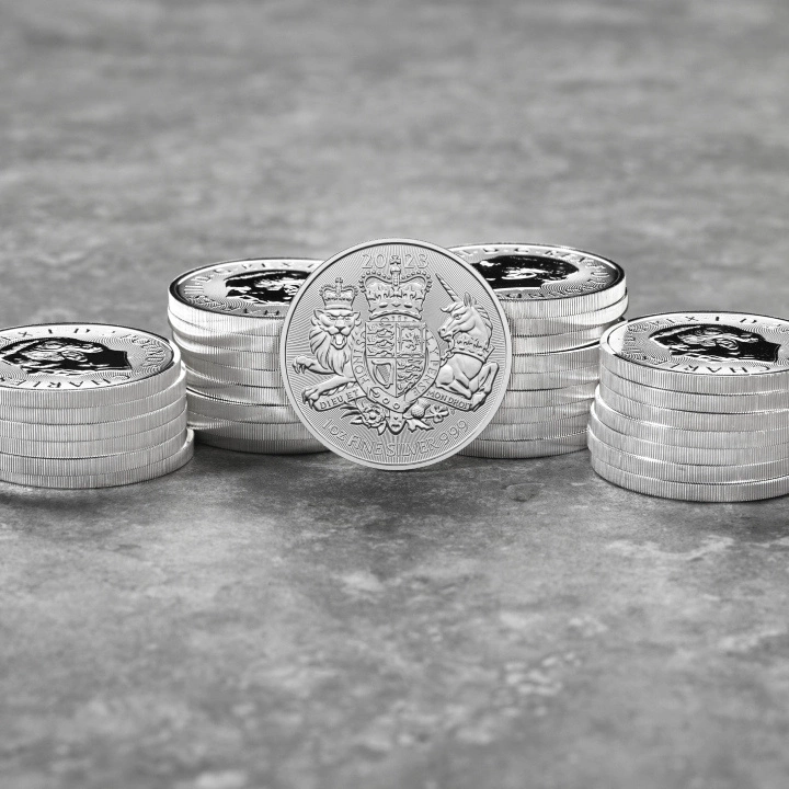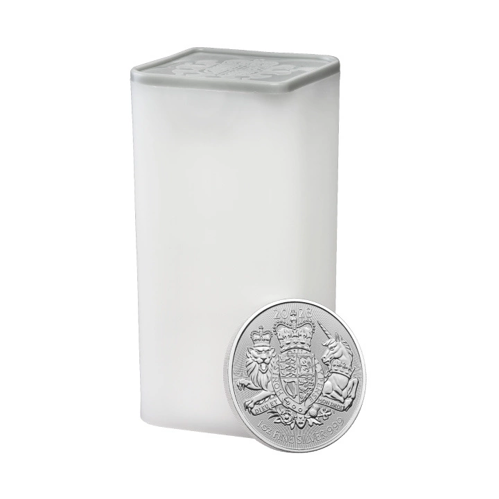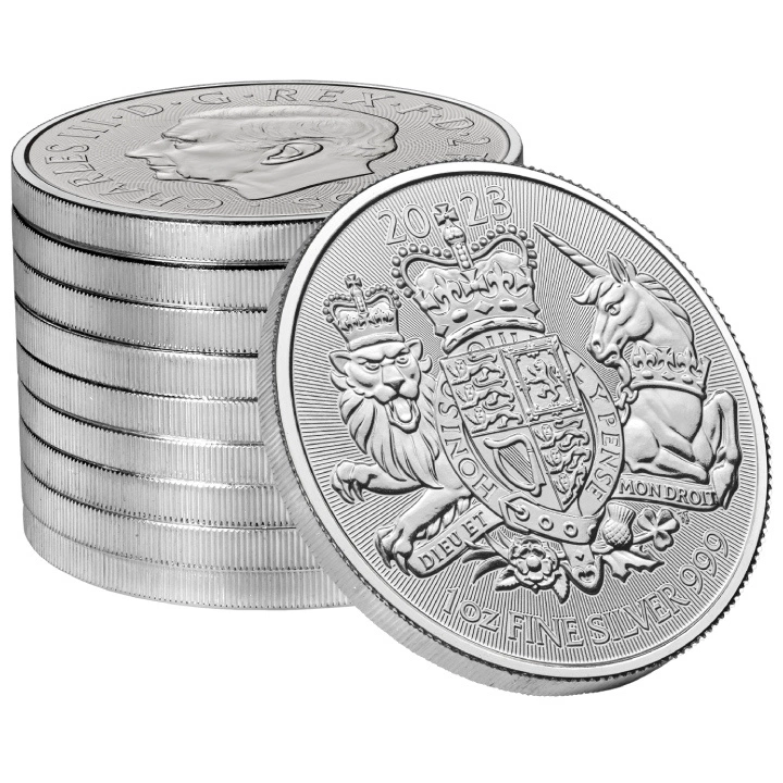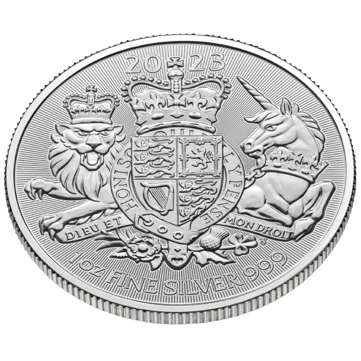 Srebrna moneta Królewskie Herby 1 uncja Srebra 2023 to piąte wydanie zyskującej na popularności bulionowej serii The Royal Arms. Produkt z 2023 roku został wyprodukowany z czystego kruszcu próby Ag.999, o wadze jednej uncji trojańskiej oraz średnicy liczącej 38.61 mm. Jest to wyrób pochodzący od renomowanego brytyjskiego producenta metali szlachetnych – The Royal Mint. Warto dodać, iż srebrna moneta Królewskie Herby posiada gwarancję rządu Wielkiej Brytanii oraz stanowi pełnoprawny środek płatniczy na terenie kraju emitenta.