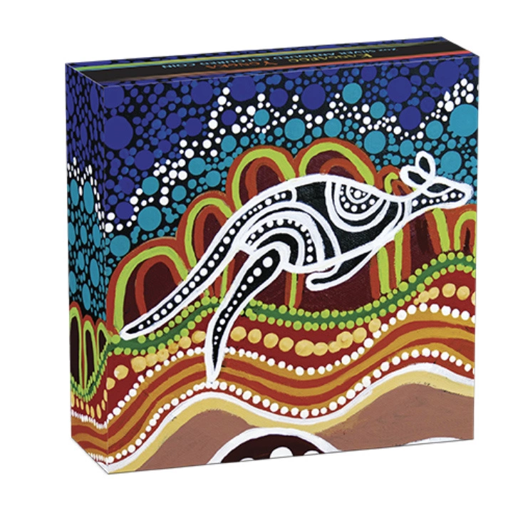 Moneta kolekcjonerska Kangaroo Yongka kolorowany 2 uncje Srebra 2023 Antiqued Coin prezentuje kangura inspirowanego kulturą Aborygenów. Egzemplarz został zaprojektowany przez artystę Kevina Bynder'a, który pochodzi z plemienia Whadjuk-Yuet-Ballardong.