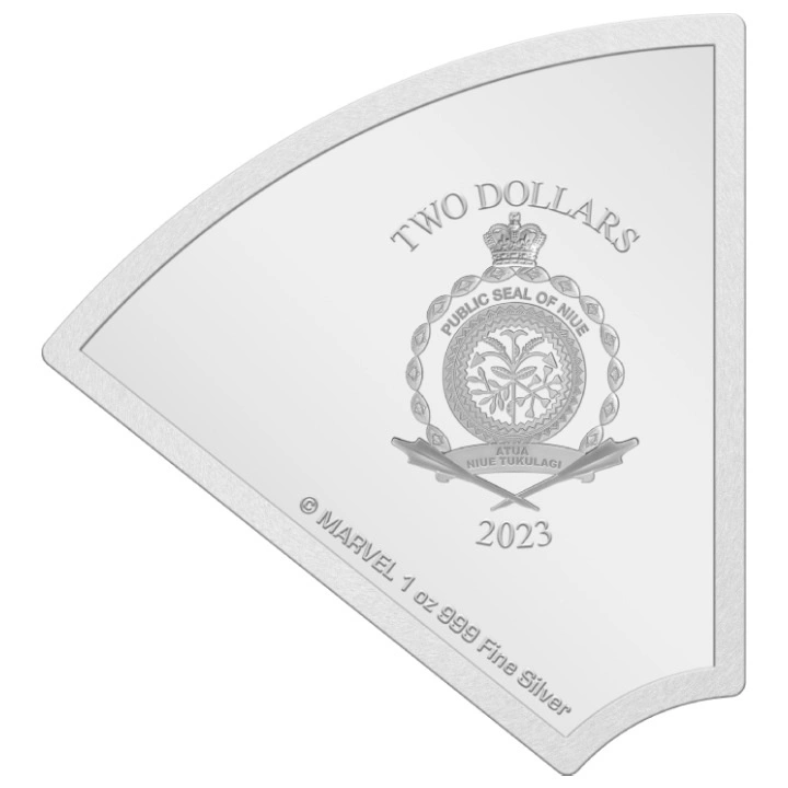 Awers srebrnej monety przedstawia herb Niue wraz z informacją o wartości nominalnej, roku bicia monety, wadze i czystości kruszcu.