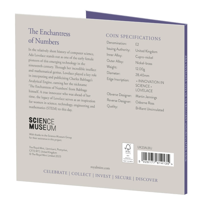 Moneta Ada Lovelace £2 Miedzionikiel 2023 upamiętnia wizjonerkę ery komputerów Adę Lovelace. Była świetną matematyczką i wielką wielbicielką poezji. Lovelace uznawana jest za pierwszą osobę, która napisała program komputerowy.