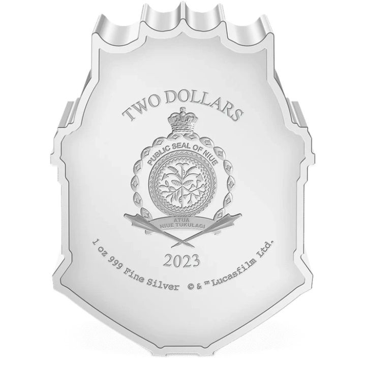 Awers srebrnej monety przedstawia herb Niue oraz informacje na temat wartości nominalnej, roku emisji ,wagi i czystości kruszcu oraz praw autorskich należących do Lucas film Ltd.