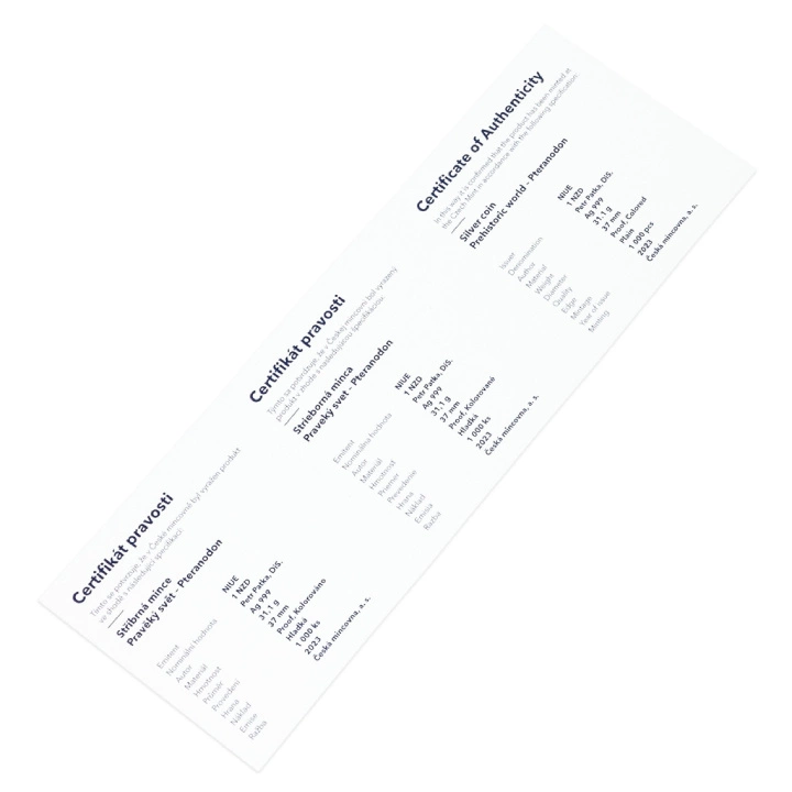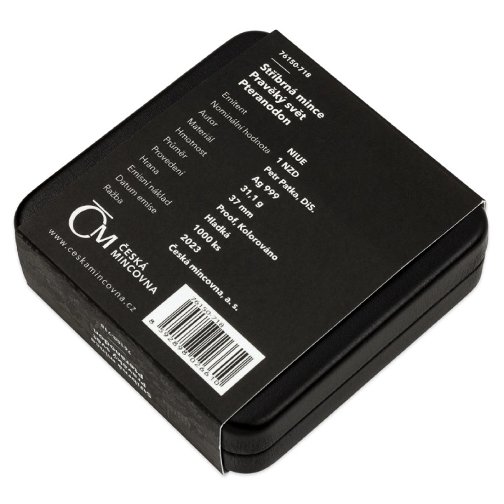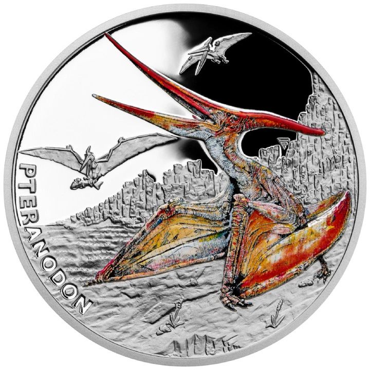 Niue: Prehistoric World - Pteranodon kolorowany $1 Srebro 2023 Proof jest siódmą monetą z serii "Prehistoric World". Moneta przedstawia prehistorycznego, roślinożernego dinozaura. Zwierzę żyło około 86-84 m mln lat temu. Był latającym dinozaurem o rozpiętości skrzydeł sięgającej 7 metrów, co czyniło go jednym z największych znanych pterozaurów. Jego dziób miał ponad metr długości i był używany do łowienia ryb.