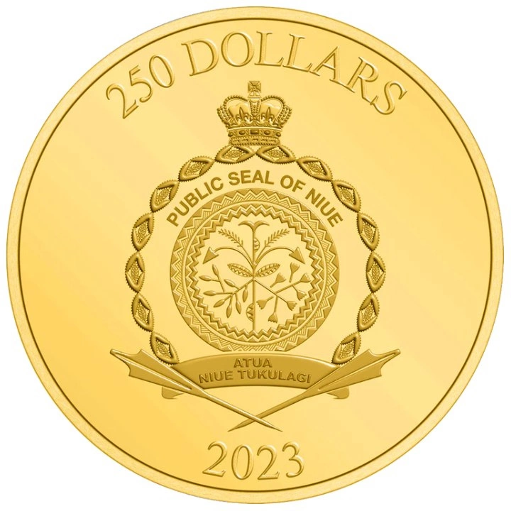 Awers złotej monety przedstawia herb Niue oraz wartość nominalną oraz rok emisji waloru.
