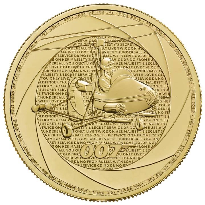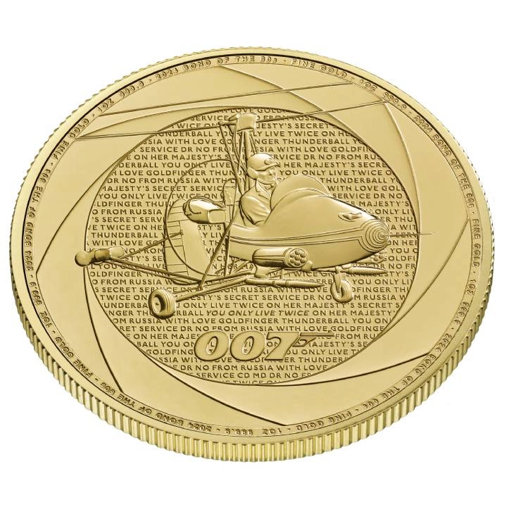 Rewers monety przedstawia scenę z filmu "You Only Live Twice", gdzie James Bond leci w wiatrakowcu "Little Nellie” oraz logo 007 i datę emisji.
