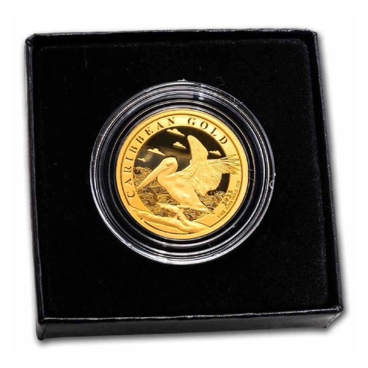 Moneta Barbados: Caribbean Pelican 1 uncja Złota 2023 to unikatowy walor, który przedstawia pelikana brunatnego. Pelikan wraz z koryfeną są symbolicznymi zwierzętami, które znajdują się w herbie Barbados. Produkt jest 4 walorem z serii Caribbean Series.