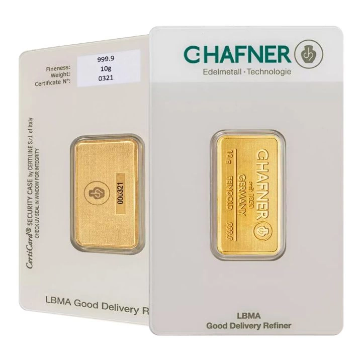 Sztabka o masie 10 g i próbie 999,9 zawiera 99,99% czystego złota. Awers zdobi grawer z logo C.HAFNER, precyzyjne oznaczenie próby oraz indywidualny numer seryjny, który umożliwia jednoznaczną identyfikację. Rewers został pozostawiony w gładkiej formie, co akcentuje minimalistyczny charakter produktu i ułatwia łączenie sztabek w zestawy inwestycyjne.