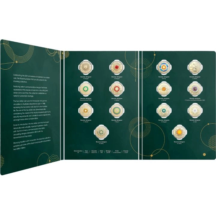 Royal Australian Mint wyprodukował oszałamiającą kolekcję czternastu monet - 35th Anniversary of the Two Dollar kolorowany Brąz Aluminiowy 2023, zawierającą wybór pamiątkowych projektów, które pojawiły się na odwrocie 2-dolarowej australijskiej monety. Od czasu wprowadzenia waloru na rynek w 1988 roku projekty, które pojawiły się na australijskiej monecie dwudolarowej są uhonorowaniem wielu postaci i wydarzeń historycznych.