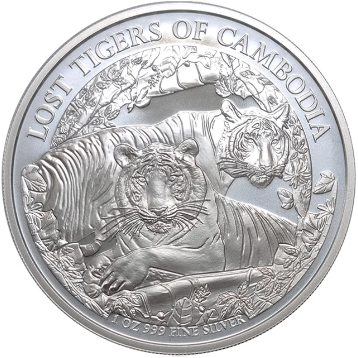 Rewers srebrnej monety przedstawia tygrysa oraz napis "LOST TIGERS OF CAMBODIA", a także wagę i próbę kruszcu.